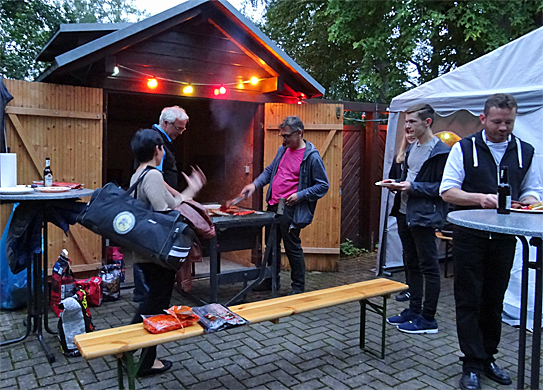 | Gleichzeitig hat sich das Zelt gut gefüllt. Das leckere Grillgut und die diversen Kaltgetränke fanden dann auch reißenden Absatz. Natürlich wurde die Trainingszeit maßlos überzogen, aber dafür brauchten wir auch keine Matten abbauen. ;) Einhelliger Tenor der Veranstaltung: Das sollten wir öfter machen! |